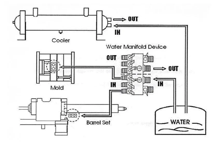 Để tránh bất kỳ tác dụng nhiệt không tốt nào của nhựa nóng khi được đưa từ barrel đến xylanh phun thủy lực, gây nên vấn đề quá nóng và không thể cung cấp nhựa phun, sử dụng hệ thống làm mát barrel. Nhiệt độ của vòng nước này có thể kiểm soát tùy thuộc vào thiết bị manifold. Hệ thống nước làm mát được minh họa như hình sau: