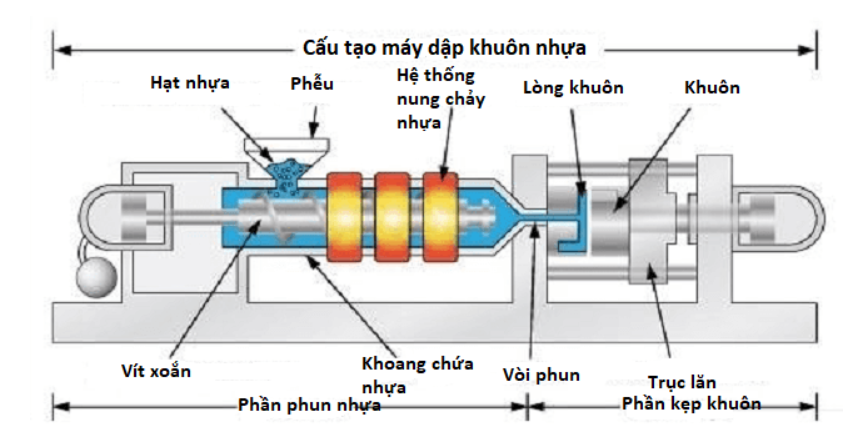 Máy đúc nhựa có cấu tạo cơ bản gồm 2 phần chính: